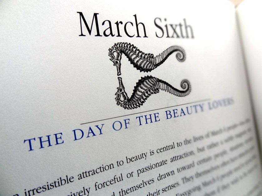 So it’s no surprise that when I first met my husband and we had dinner at his place, I found this mega-anthology of birthday insight on his bookshelf. Over the years it’s become a measure of what’s happening in our lives. Reading about each other’s birth dates, for the first time, and being thrilled over the discoveries. Reading it alone for that same reason. Reading our children’s on each of the days they arrived.