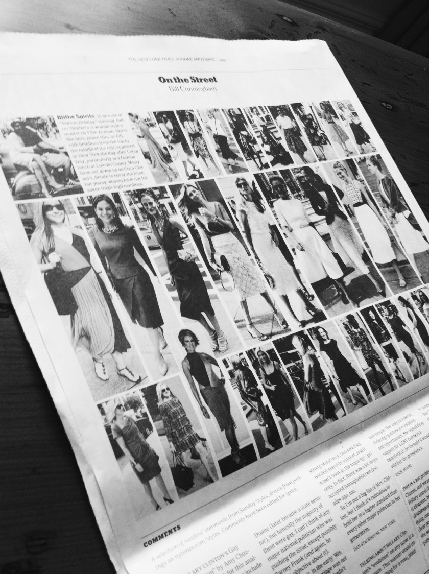 What I pluck first? Usually SundayReview or SundayStyles. But one thing I love most is Bill Cunningham’s On the Street, the photo spread dedicated to what New York women are wearing. The collage of how people are dressing, in real life, is so intriguing. Especially for someone like me, who lives in jeans and tees.